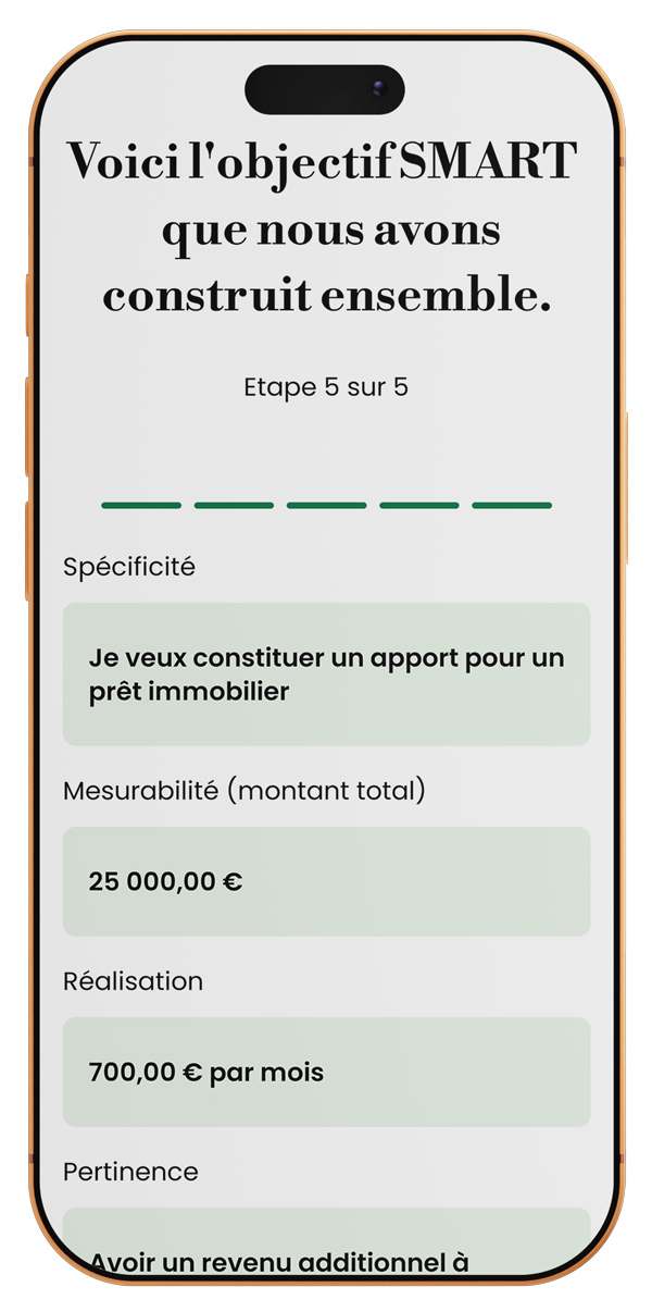 - "Enfin une app de finance personnelle en français qui me parle vraiment ! Les objectifs SMART m'ont aidée à structurer mon épargne pour mon projet immobilier. En 3 mois, j'ai économisé 30% de plus qu'avant. Le diagnostic financier est ultra pertinent. Je recommande vivement !" Marie T France 5.0