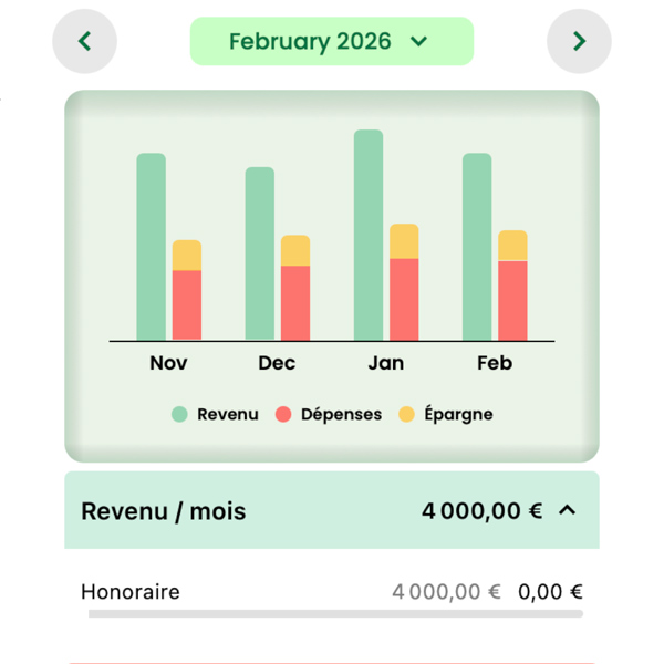 Analysez vos progrès mois après mois grâce à des graphiques clairs et des indicateurs précis de votre santé financière.